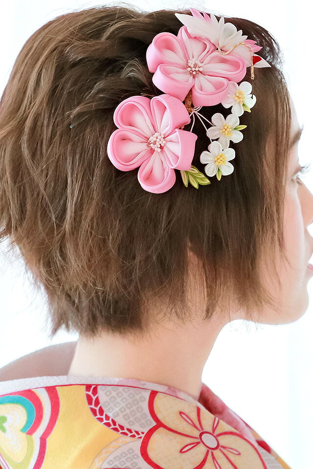 成人式の振袖にオススメなつまみ細工の髪飾り綺麗なお花をモチーフにした、つまみ細工の髪飾りです。