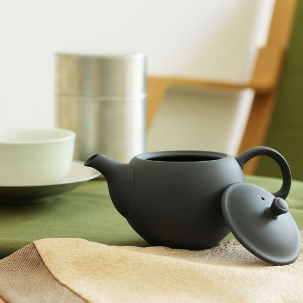朱泥の生地に呉須とマンガンを混ぜたものをかけ、酸化焼成により急須表面を黒色に発色させました。
