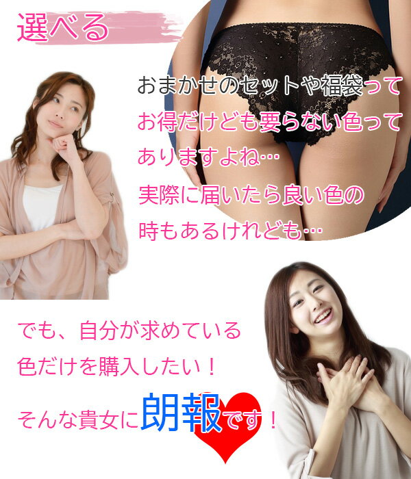 極上エレガントショーツ 2枚セット 商品説明 お色が選べる2枚セット 1枚で購入するよりさらにお得 お好きなお色を8色からお選び下さい 1枚目・2枚目 と各色お選びください 貴女に高級をいかがですか? 総レースの定番!極上の履き心地 ボトムスにひびきにくいエレガントな ショーツです。