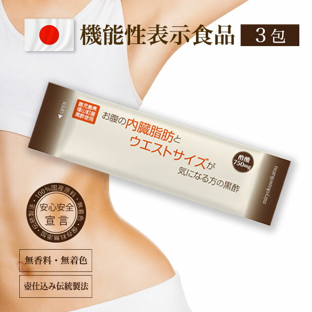お腹の内臓脂肪とウエストサイズが気になる方の黒酢:3包 機能性表示食品 コロナ太り 巣ごもり 減らす 酢酸 アミノ酸 ダイエット 黒酢 スティック ファスティング 酵素 断食 置き換え ドリンク サプリ 国産 鹿児島 ゆうパケット 39ショップ