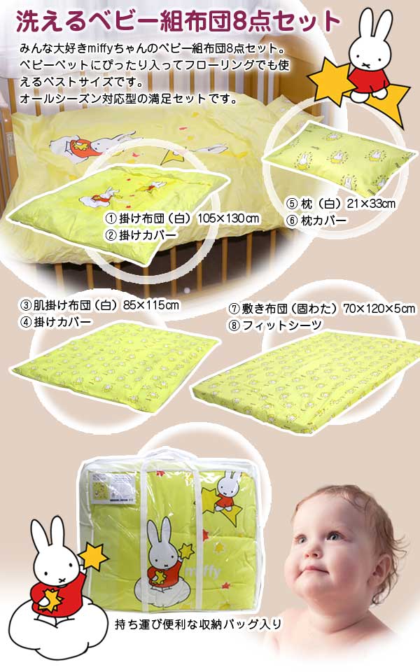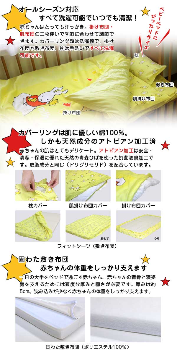 【最安値に挑戦!】ミッフィー・ベビー組布団8点セット(スター?)/組ふとんセット/miffy/ベビー寝具 ≪人気のキャラクター8点組布団セットをお買い得価格で!アトピアン加工で安心・安全!≫ 掛け布団は厚めのタイプと薄めの肌掛布団の2種類ありますので、季節に合わせてお使いいただけます。