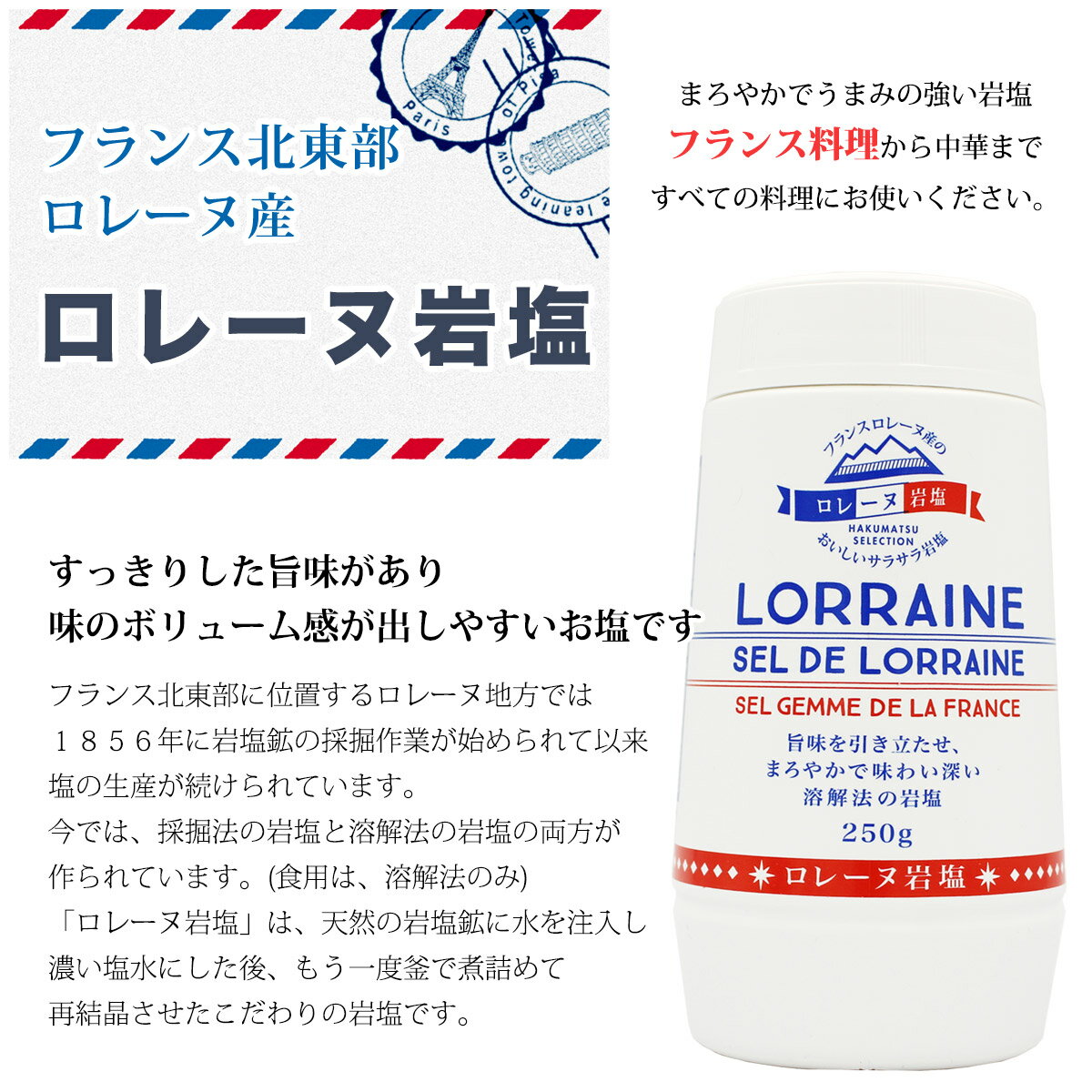 【お塩専門 美味しんぼ本舗】フランス産 ロレーヌ岩塩 250g × 1本 (卓上ボトル) フランス産 ロレーヌ岩塩 250g × 1本(卓上ボトル) 名 称 食塩 原 材 料 名 岩塩(フランス) 原 産 国 名 フランス 内 容 量 250g × 1本 販 売 店 舗 【美味しんぼ本舗 株式会社】長崎県対馬市美津島町竹敷深浦4-133 EC事業部 連絡先:03-6825-1104 / oishimbo_2@shop.rakuten.co.jp 輸 入 者 【株式会社 白松】東京都港区赤坂7-7-13(TEL:03-5570-4545) 製 造 方 法 原 材 料 名 岩塩(フランス・ロレーヌ地方) 工 程 溶解、立釜、乾燥